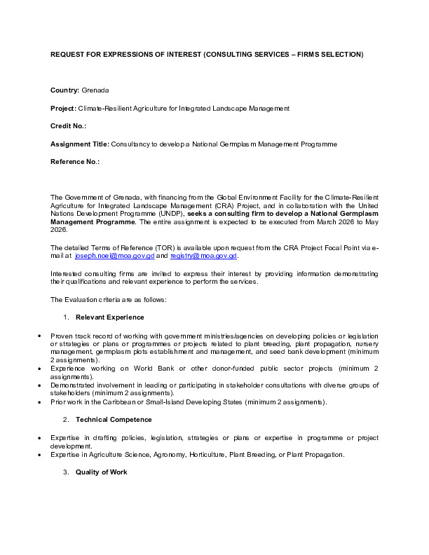 The Climate Risk Screening Specialist will be engaged in a fixed-price consultancy, expected to be implemented within two-man months, over three months. Expressions of Interest (including disclosure of any actual or potential conflict of interest) must be submitted with the headline GCF Readiness and Preparatory Support Programme - Climate Risk Screening Specialist on or before 2 pm AST, March 5th, 2026.